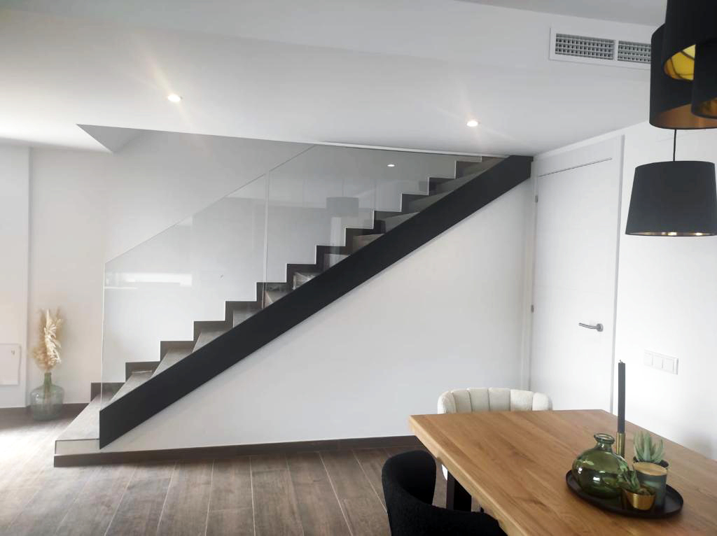 La escalera recta, en cambio, tiende a pasar más desapercibida, integrándose de forma más neutra en la distribución. La elección depende de si se busca protagonismo o discreción dentro del conjunto de la vivienda.