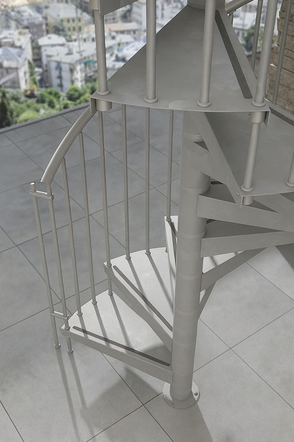 Columna central de cilindros metálicos galvanizados en caliente, intercalados con anillas de nylon que ajustan la contrahuella. La capa de pintura epoxi horneada refuerza la resistencia frente a lluvia, sol y corrosión.