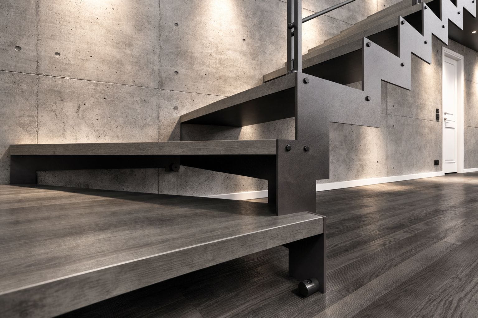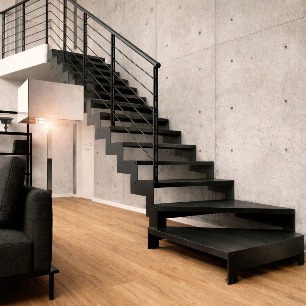 Doble estructura lateral metálica de 8 mm conformada en perfil “Z” para una escalera firme, limpia y de estética actual.