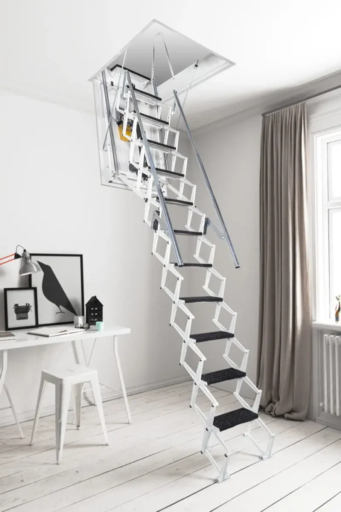 Una escalera escamoteable es aquella que se pliega y se oculta, normalmente en el techo o en un compartimento superior. Su principal ventaja es el ahorro de espacio: solo se despliega cuando se necesita. Se utilizan sobre todo para accesos puntuales o secundarios, aunque algunos modelos permiten un uso más frecuente.