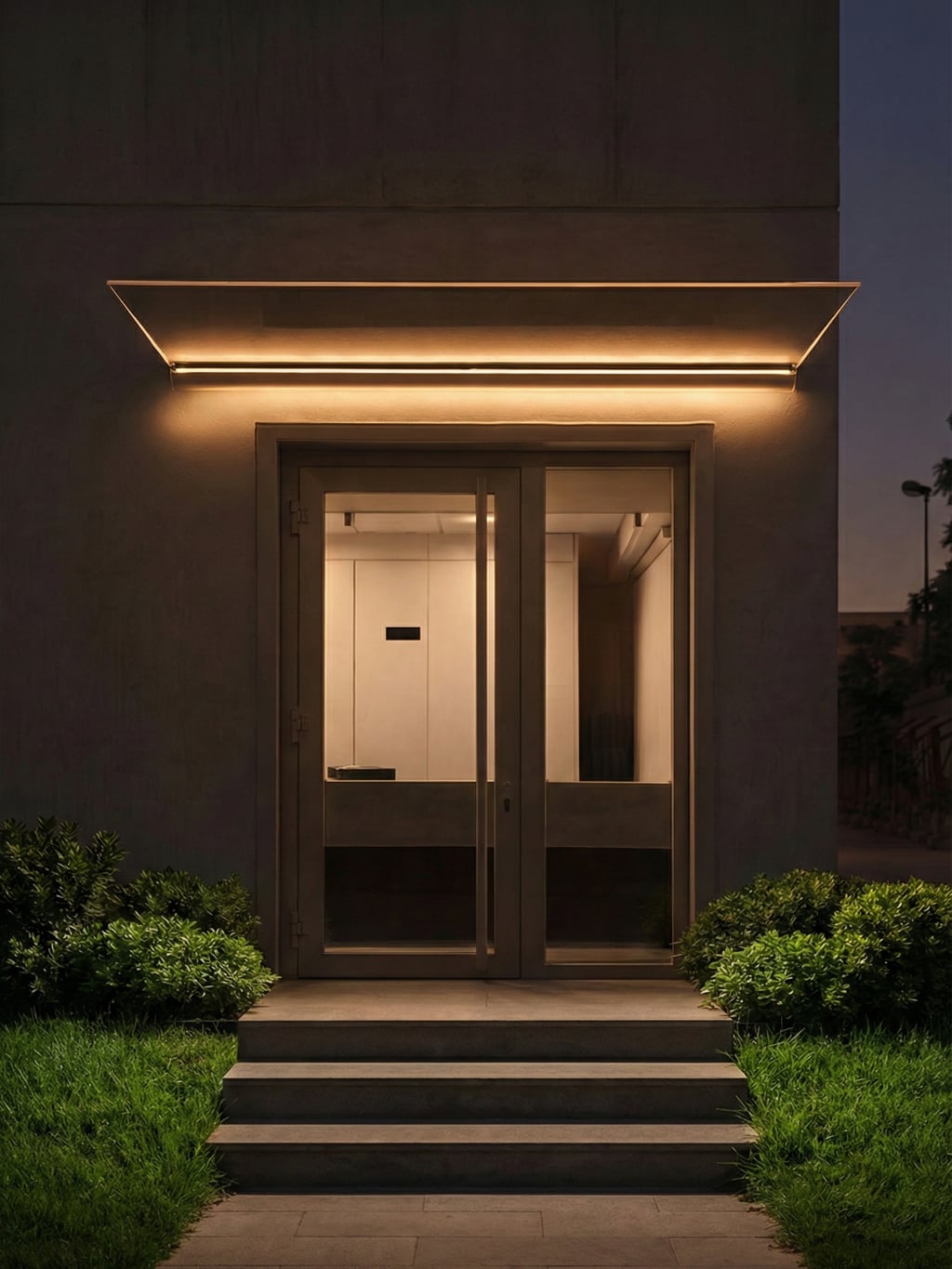 La incorporación de sistemas LED permite que la marquesina no solo proteja, sino que también aporte iluminación funcional al acceso.