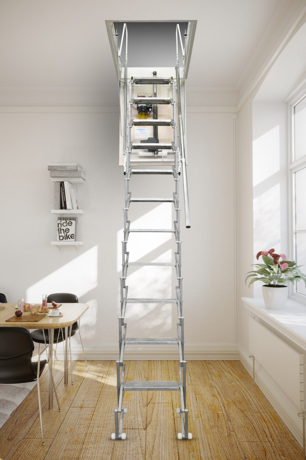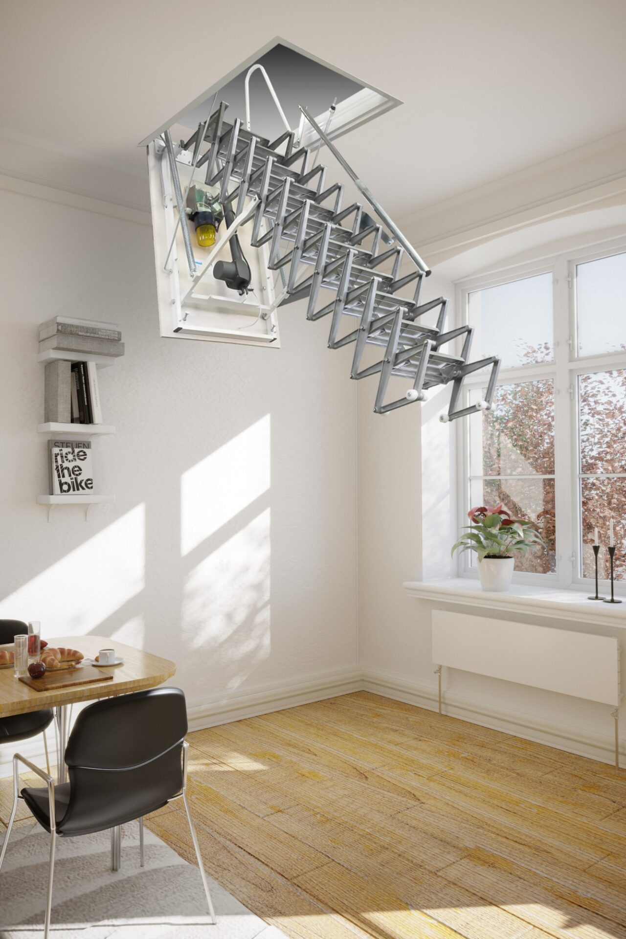 Escalera escamoteable motorizada tipo pantógrafo, fabricada en aluminio inyectado y panel aislante de contrachapado de álamo. Su sistema electromecánico de 230 V incluye mando a distancia y apertura manual de emergencia, ofreciendo un acceso cómodo y seguro a altillos y falsos techos.