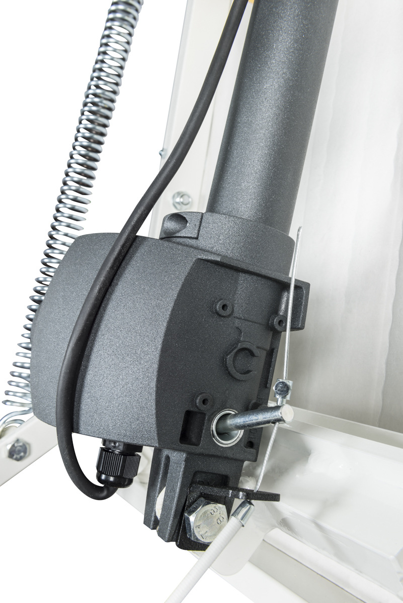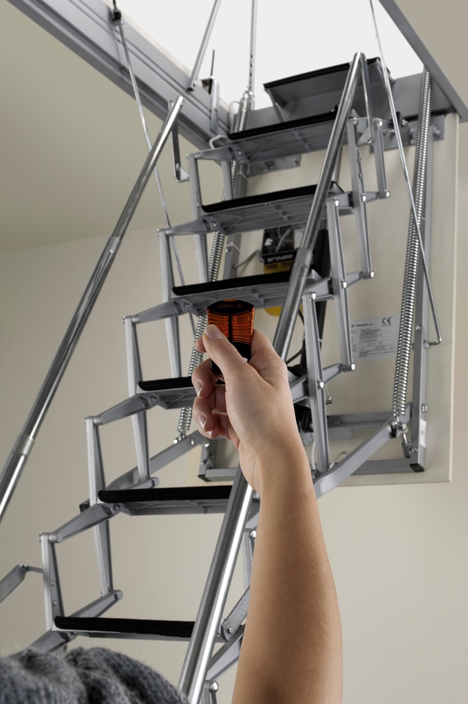 • Accionamiento electromecánico 230 V / 50 Hz: incluye cuadro de control electrónico, intermitente luminoso y radiomando para abrir y cerrar la escalera con total seguridad.
